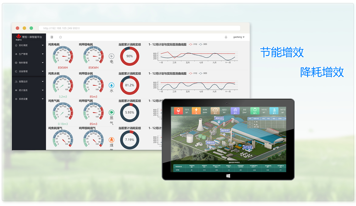 系统在实现各车间风、水、电、气集中管控和精细化管理的同时,使能源消耗总量可控,能源异常可见;通过对能源的消耗情况的精确统计分析,掌握各个工序/车间能源消耗/产出/转换的过程情况,实现能源智能核算与绩效考核,将能源管理活动落实到日常的生产管理之中,推动各单位能源高效利用,实现节能增效、降耗增效。